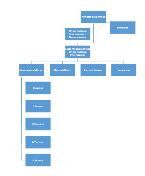 La pubblica Informazione nelle Forze Armate italiane dipende dall’Ufficio Pubblica Informazione dello Stato Maggiore della Difesa che a sua volta è collegato con il Ministro della Difesa.